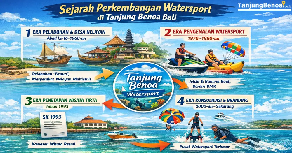 Sejarah perkembangan watersport di Tanjung Benoa mencerminkan transformasi panjang dari pelabuhan kecil abad ke-16 menjadi pusat wisata tirta modern. Kondisi alam yang tenang menjadi modal awal. Inisiatif pionir pada 1973 membuka jalan. Penetapan resmi tahun 1993 mempercepat investasi dan penguatan brand.